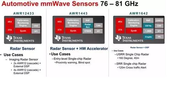 紧接着在5月16日,德州仪器推出了号称全球精度最高单芯片毫米波雷达传感器,也就是工作与76-81GHz的AWR1x和IWR1x收发器,然后基于这两片收发器推出了数个76-81GHz毫米波雷达前端,包括AWR1243、AWR1443、AWR1642。