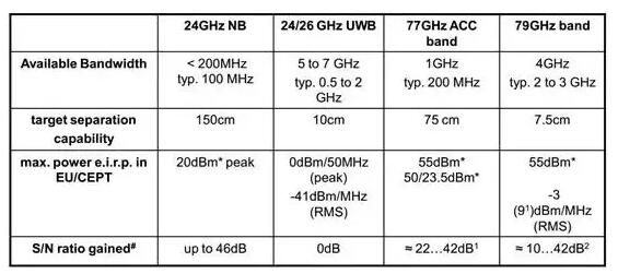 最早毫米波雷达是24GHz的窄带毫米波雷达,带宽通常不到200MHZ,精度只有75厘米,目标分离能力只有1.5米,显然这太低了,即便作为盲点检测也有点低了。这之后出现了超宽带24GHz毫米波雷达,带宽最高达7GHz,精度可达2.2厘米。但是它有一个明显的缺点,就是发射功率太低,信噪比偏低,发射功率太低意味着探测距离有限,典型的5GHz带宽的超宽带24GHz毫米波雷达最大探测距离大约为30米。再有就是干扰风险(Interference Risk),频率越低,干扰风险越高。窄带24GHz毫米波雷达的干扰风险是最高的,超宽带24GHz毫米波雷达略好,77GHz和79GHz就非常好。同时24GHz毫米波雷达的体积也比较大。此外,为了给5G或6G留出足够的频谱空间,汽车雷达也不得不向更高频率转移。