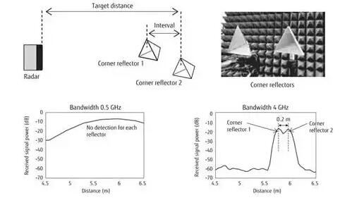 上图是500MHz带宽的77GHz FMCW雷达与4GHz带宽的79GHzFMCW雷达的对比,对于500MHz带宽的雷达,两个反射物都检测不到,79GHz都能检测得到,并且可以大致推算出两者间的距离。77GHz的目标分离精度是75厘米,也就是1.5米内的目标会被忽略,因此它只能检测车辆。