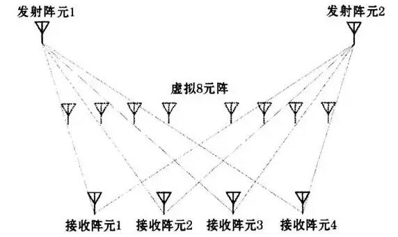 一对发射阵元和接收阵元可以虚拟出一个收发阵元,则对于M发N收的MIMO雷达 ,发射阵元和接收阵元共有M* N对 ,即可以虚拟出M *N个收发阵元 ,其个数一般是远远大于N的,从而实现了阵列孔径的扩展。例如2发4收的MIMO雷达,可以形成8元的虚拟阵列。