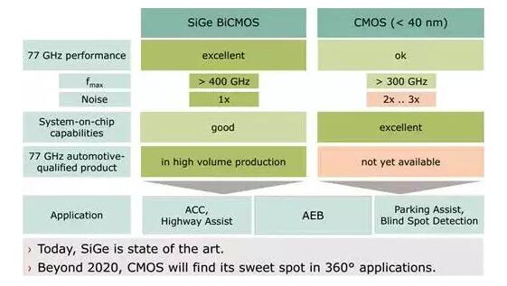 79GHz很适合多个级联应用,对价格敏感程度更高,采用硅基CMOS的需求更强烈。早在2013年,松下和富士通就开发了79GHz的硅基CMOS工艺,NXP大约在2015年底推出79GHz硅基CMOS工艺雷达收发器芯片,为40纳米CMOS RF 工艺。