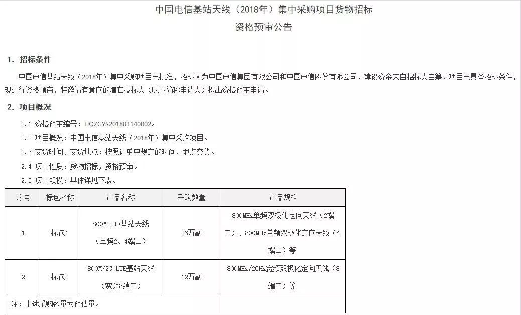 From the public information point of view, the collection is divided into two packets, a total of 380,000 base station antennas. The first standard packet is 800M LTE base station antenna (single frequency 2G4 port antenna, that is 800M 4G base station antenna; the second packet is 800M / 2G LTE base station antenna). It is a base station antenna that can be used by both 2G and 4G.